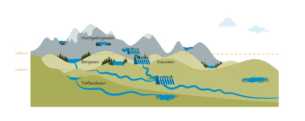 Stillgewässer zwischen 1.200 und 1.800 m ü.d.M., die oft mehrere Monate im Jahr von Eis bedeckt sind. In den Sommermonaten können sie an der Oberfläche jedoch Temperaturen von bis zu 15 °C erreichen. Sie sind in der Regel über die Seeausrinne mit größeren Fließgewässern der Talsohle verbunden, wodurch eine natürliche Besiedlung durch Fische aus dem Tal möglich war. Sie beherbergen typischerweise mehrere Salmonidenarten und kälteliebende Kleinfischarten.